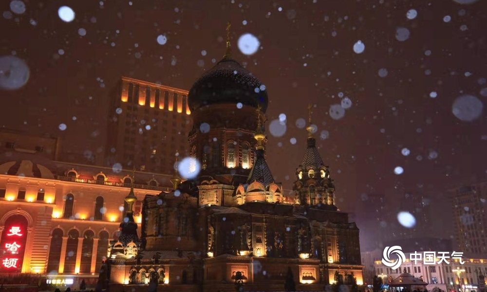 17日,哈尔滨降雪,雪中的索菲亚教堂风韵万千美如童话世界(图/冯贤 文/张译阳)